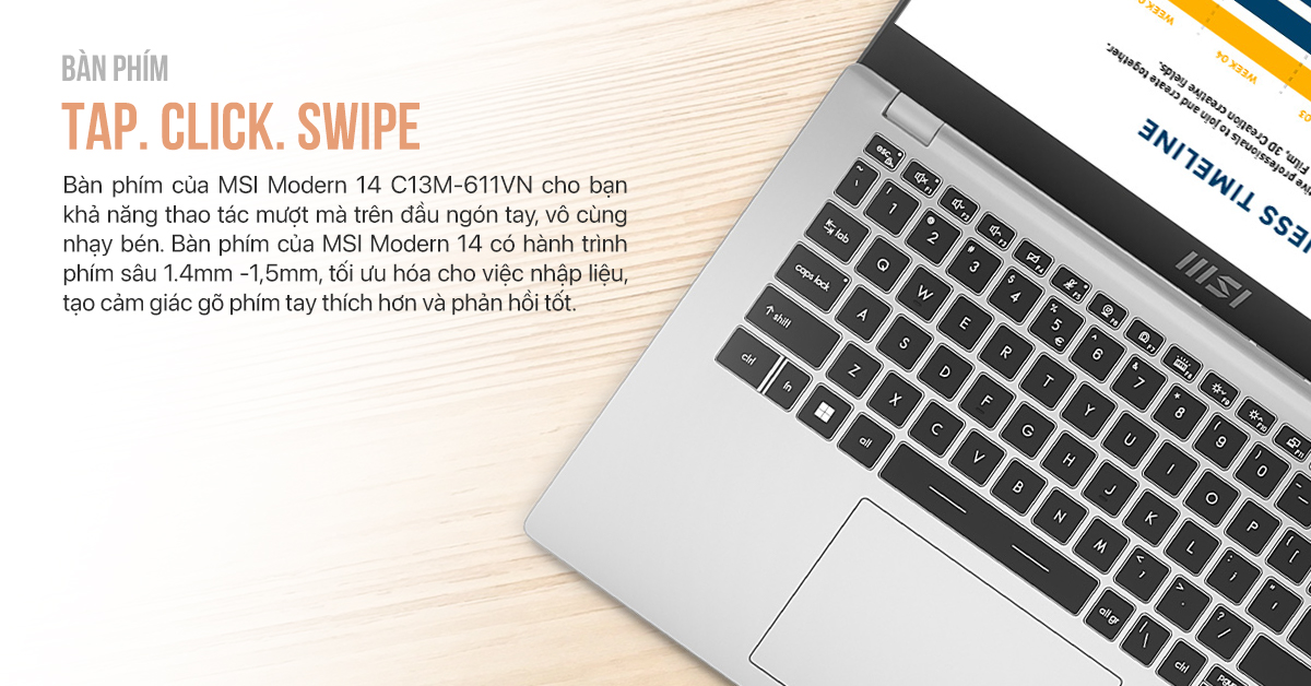Bàn phím của MSI Modern 14 C13M-611VN cho bạn khả năng thao tác mượt mà trên đầu ngón tay, vô cùng nhạy bén. Bàn phím của MSI Modern 14 có hành trình phím sâu 1.4mm -1,5mm, tối ưu hóa cho việc nhập liệu, tạo cảm giác gõ phím tay thích hơn và phản hồi tốt.