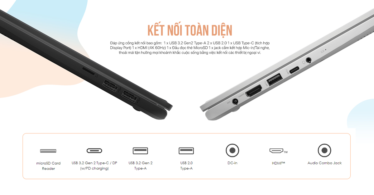 Đáp ứng cổng kết nối bao gồm:  1 x USB 3.2 Gen2 Type-A 2 x USB 2.0 1 x USB Type-C (tích hợp Display Port) 1 x HDMI (4K 60Hz) 1 x Đầu đọc thẻ MicroSD 1 x jack cắm kết hợp Mic-in/Tai nghe, thoải mái tận hưởng mọi khoảnh khắc cuộc sống bằng việc kết nối các thiết bị ngoại vi.