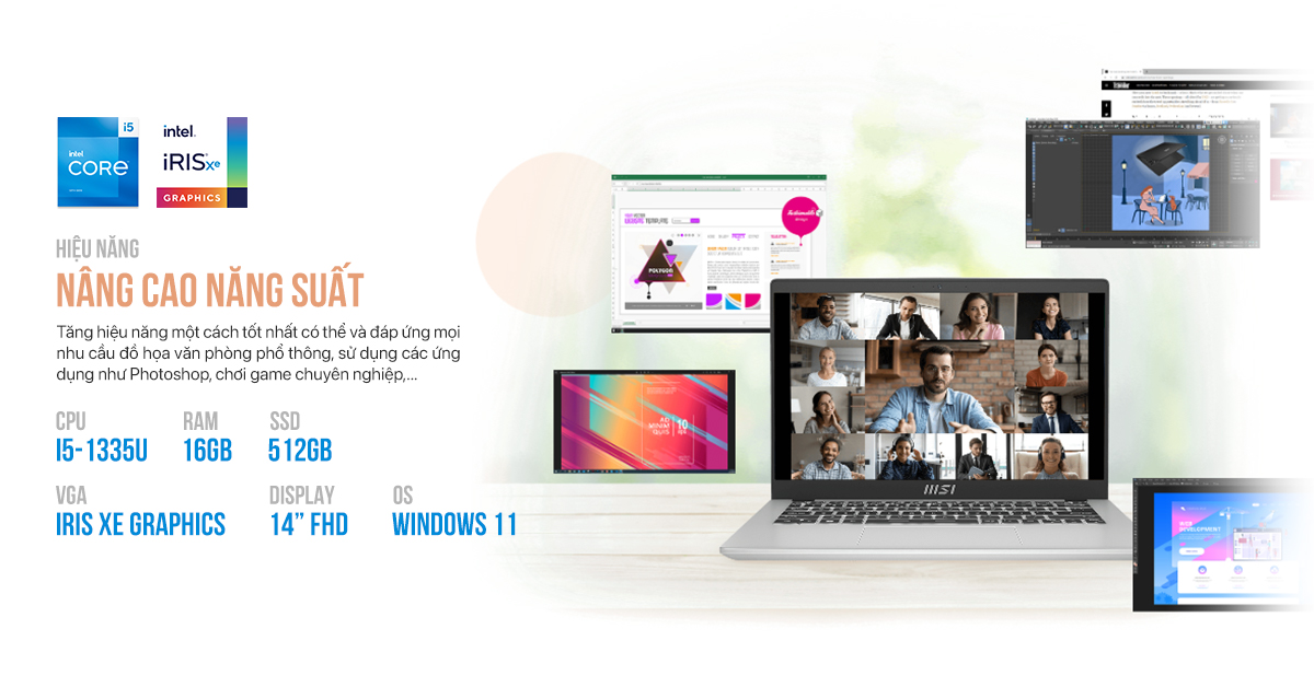 Nếu so với các dòng laptop văn phòng cùng phân khúc khác thì MSI Modern 14 C13M-611VN có cấu hình vượt trội hơn hẳn, máy được trang bị CPU Intel Core i5 thế hệ 13 Intel Core i5-1335U với 10 nhân 12 luồng cho tốc độ xử lý tối đa đạt 4.6GHz dư sức hỗ trợ bạn làm việc, học tập, thiết kế, chơi game hằng ngày một cách đơn giản, trơn tru. Tích hợp card đồ họa Intel Iris Xe Graphics giúp tăng hiệu năng một cách tốt nhất có thể và đáp ứng mọi nhu cầu đồ họa văn phòng phổ thông, sử dụng các ứng dụng như Photoshop, chơi game chuyên nghiệp...