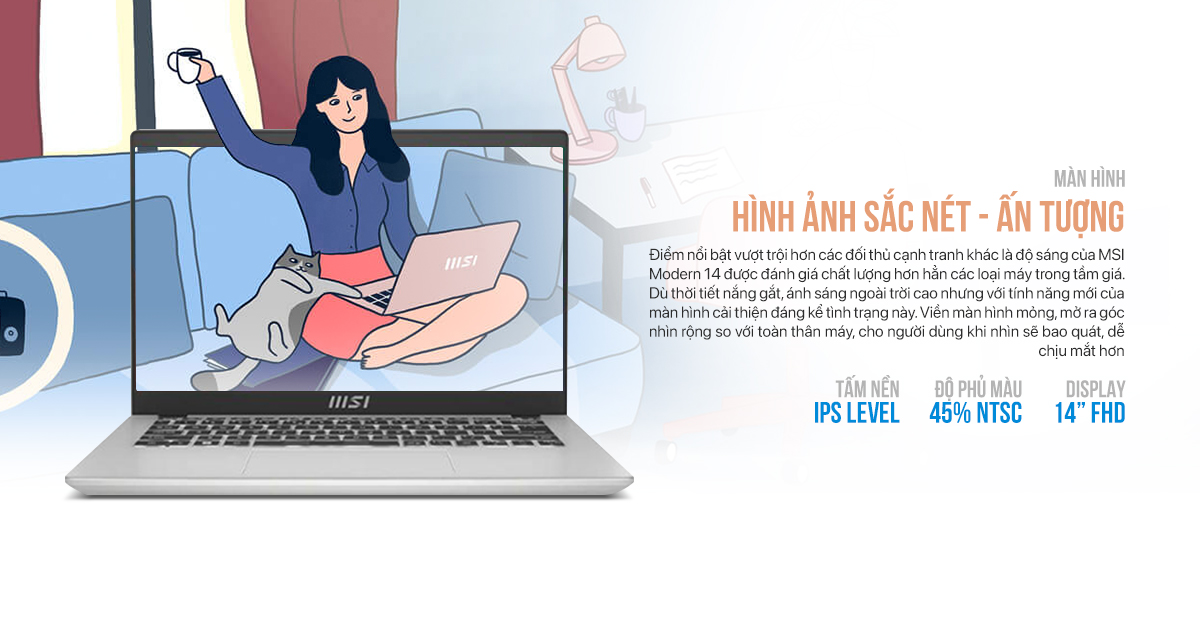 MSI Modern 14 C13M-611VN là một trong những chiếc laptop dành cho sinh viên có màn hình ấn tượng nhất! Với độ phân giải Full HD, kích thước 14 inch. Đây quả thực là một màn hình xuất sắc trong tầm giá 17 triệu với thiết kế viền siêu mỏng, góc nhìn rộng, độ nét cao. Điểm nổi bật vượt trội hơn các đối thủ cạnh tranh khác là độ sáng của MSI Modern 14 được đánh giá chất lượng hơn hẳn các loại máy trong tầm giá. Dù thời tiết nắng gắt, ánh sáng ngoài trời cao nhưng với tính năng mới của màn hình cải thiện đáng kể tình trạng này. Viền màn hình mỏng, mở ra góc nhìn rộng so với toàn thân máy, cho người dùng khi nhìn sẽ bao quát, dễ chịu mắt hơn.