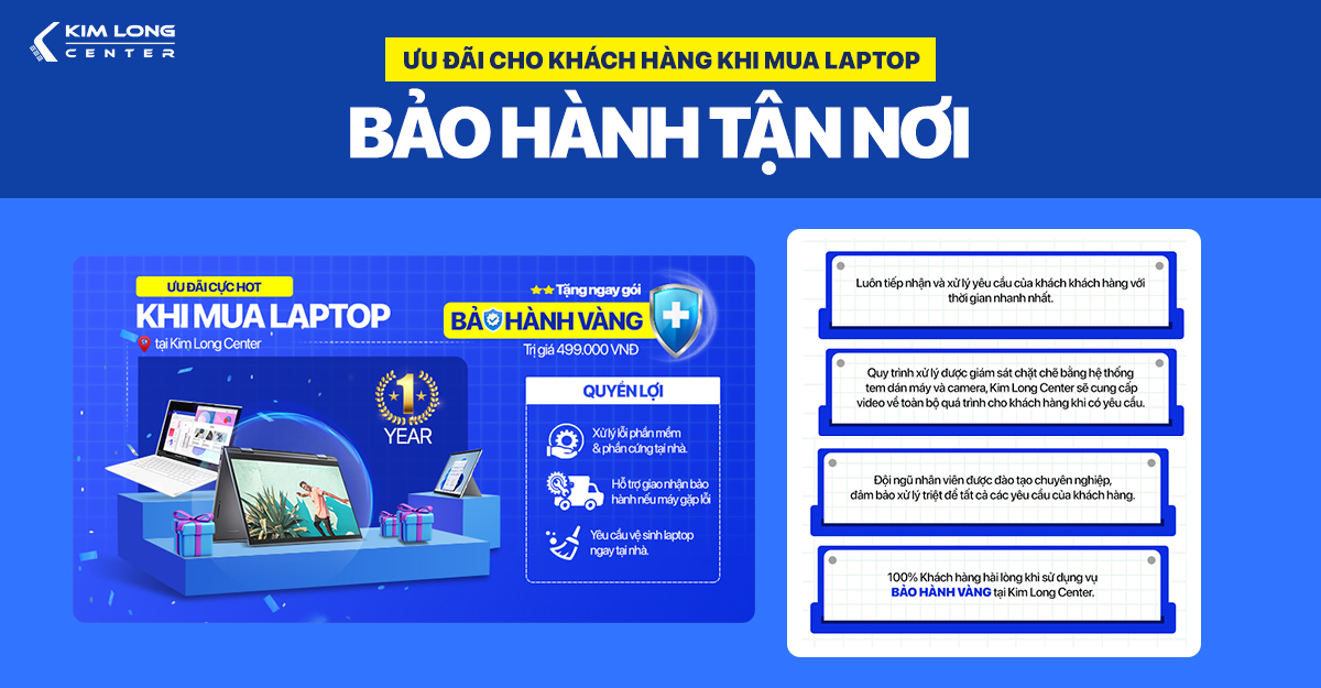 Với tiêu chí luôn đảm bảo cho khách hàng của mình có trải nghiệm về sản phẩm tốt nhất, cửa hàng laptop Kim Long Center còn đi kèm cho khách hàng của mình một mức bảo hành cao với gói Bảo Hành Vàng trị giá 499k, cùng các hỗ trợ hấp dẫn khác như: